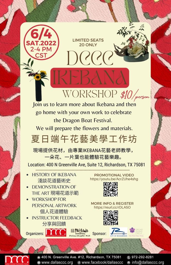 Join us to learn more about Ikebana and then go home with your own work to celebrate the Dragon Boat Festival. We will prepare the flowers and materials. Space is limited to 20 persons. Register as soon as possible to save your spot.