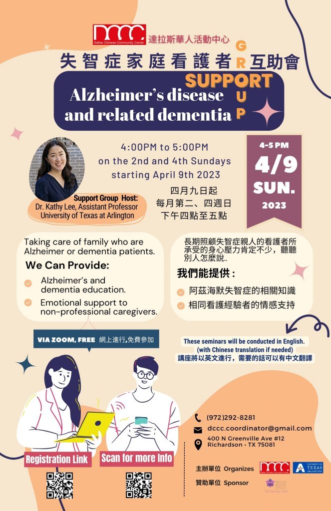 The Dallas Chinese Community Center and Dr. Lee from the University of Texas at Arlington School of Social Work are hosting a support group for people caring for their loved ones living with Alzheimer’s disease and related dementia. The support group will be conducted via Zoom, from 4:00PM to 5:00PM on the 2nd and 4thSundays starting April 9th 2023. The support group will focus on Alzheimer’s and dementia education and provide emotional support to non-professional caregivers.