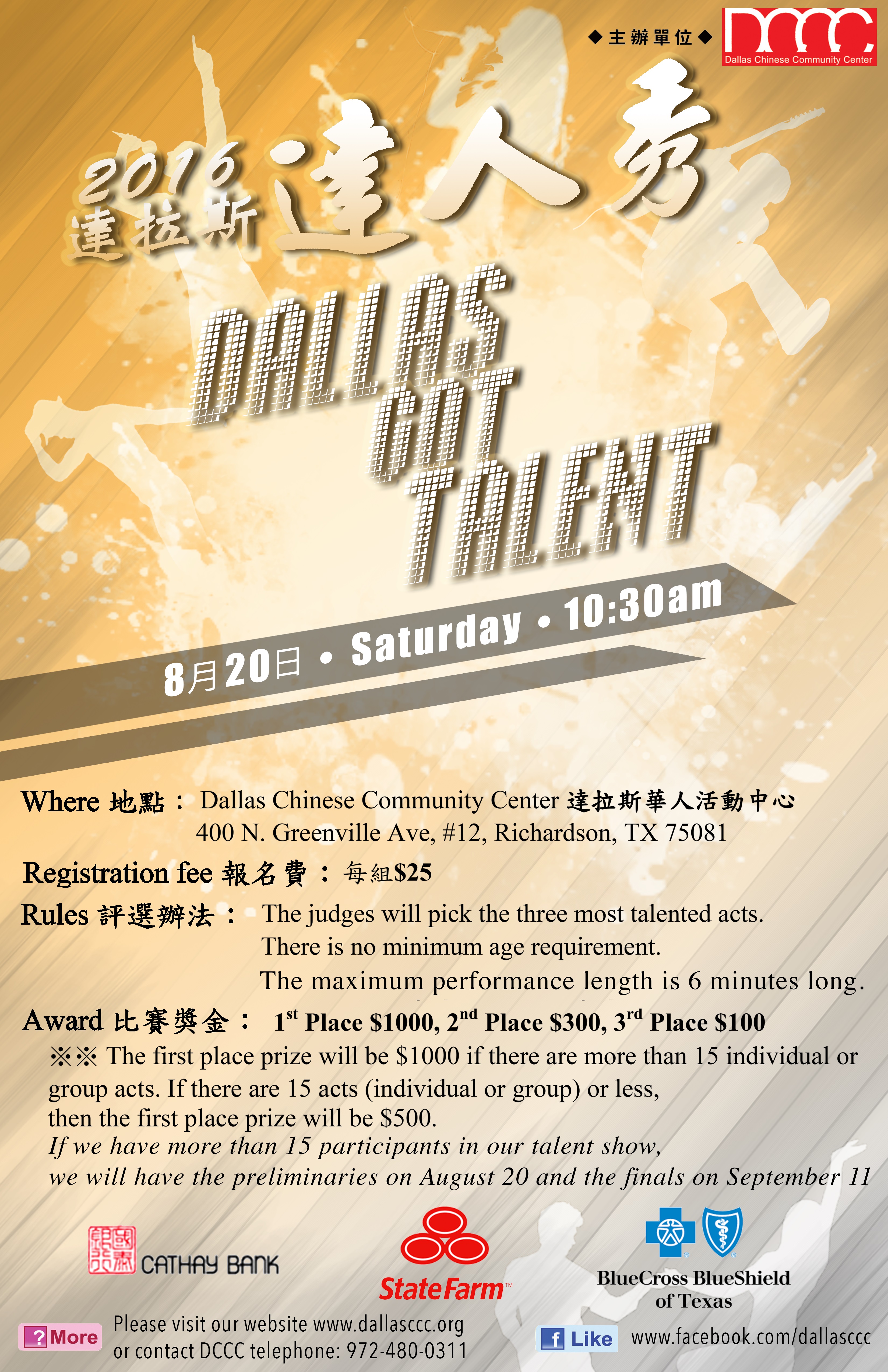 On August 20 (10:30am), DCCC will host Dallas Got Talent, a talent show competition. If you or a group of your friends have a talent, whether it be dancing, musical instrument, chinese yo-yo, comedy, magic, singing, etc., come showcase it on August 20. If you are interested in competing in the event, registration fee is $25.