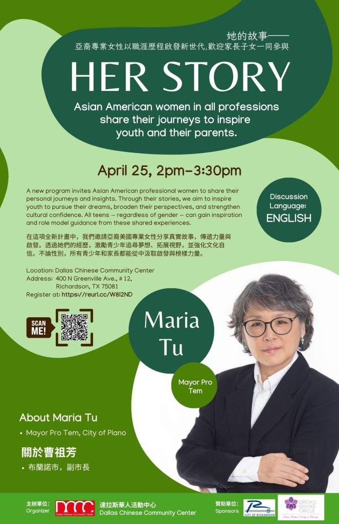 Her Story —— Asian American women in all professions share their journeys to inspire youth. Maria Tu, 4/25/2026 @2-3:30pm