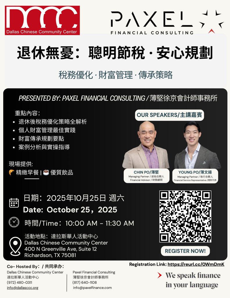 This event is co-organized by Dallas Chinese Community Center (DCCC) and Paxel Financial Consulting.