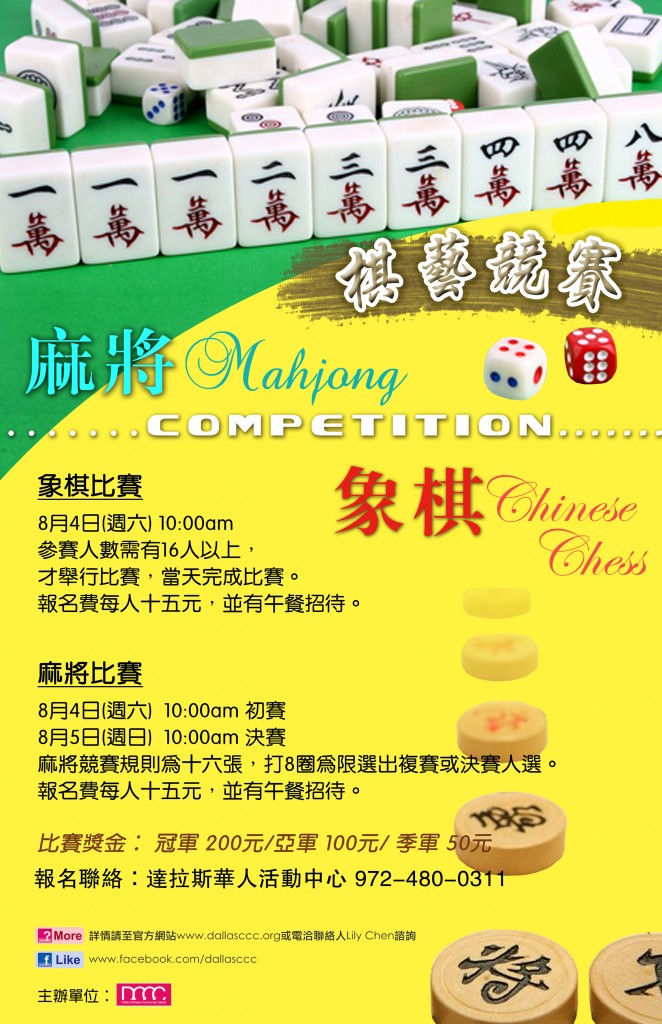 麻將是一種講究排列組合與記性的靈活遊戲,勤於動腦、多交朋友可以延緩老化,對活化大腦與交誼都有幫助,今年麻將比賽將於八月四日(週六)上午十時舉行初賽,八月五日(週日)進行決賽。報名資格並無限制,報名費每人十五元,並有午餐招待,麻將競賽規則為十六張,打8圈為限,選出複賽或決賽人選,比賽獎金為第一名獎金200元,第二名100元,第三名50元。