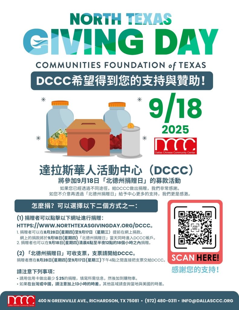 達拉斯華人活動中心(DCCC)將參加9月18日「北德州捐贈日」的募款活動。