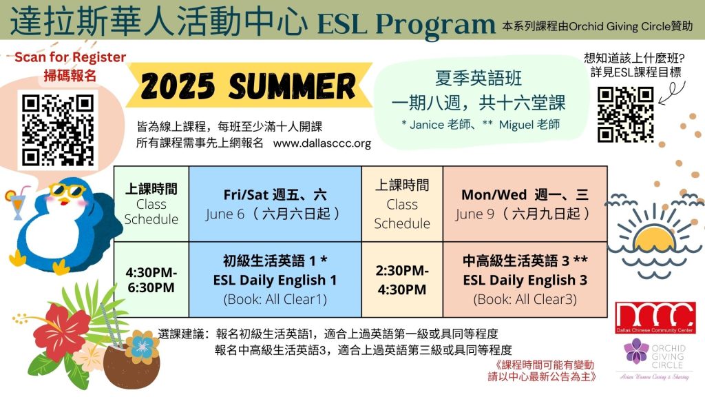 達拉斯華人活動中心繼續開辦一系列就業/在職訓練系列課程,由 Orchid Giving Circle 贊助,ESL夏季班課程將由多年教學經驗的認證ESL老師帶領,即日起接受報名,歡迎有興趣學習英語、加強自己的民眾一起來報名上課,以提升自己的職場競爭力。課程需事先上網報名登記,課程資訊會於開課前告知,課程免費,書本費用另計,每班至少滿十人才開課。更多詳情請洽達拉斯華人活動中心:972-480-0311