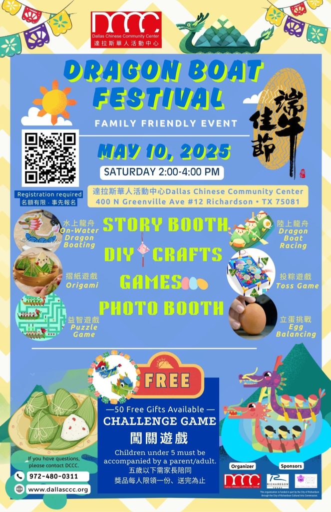 🐲歡迎各位大小朋友,2025年5月10日(星期六)下午2點,相約達拉斯華人活動中心,「粽情歡樂迎端午」,一起來玩遊戲、做手作、拿小禮物!親子共遊輕鬆又有趣 !💚特別為親子家庭設計,集結了傳統文化、趣味遊戲與手作體驗,是認識端午節的絕佳機會,更是親子共度美好時光的好時機!本活動免費入場須事先報名,適合所有年齡層,尤其歡迎有小朋友的家庭前來參加,一起感受濃濃的端午節氛圍!